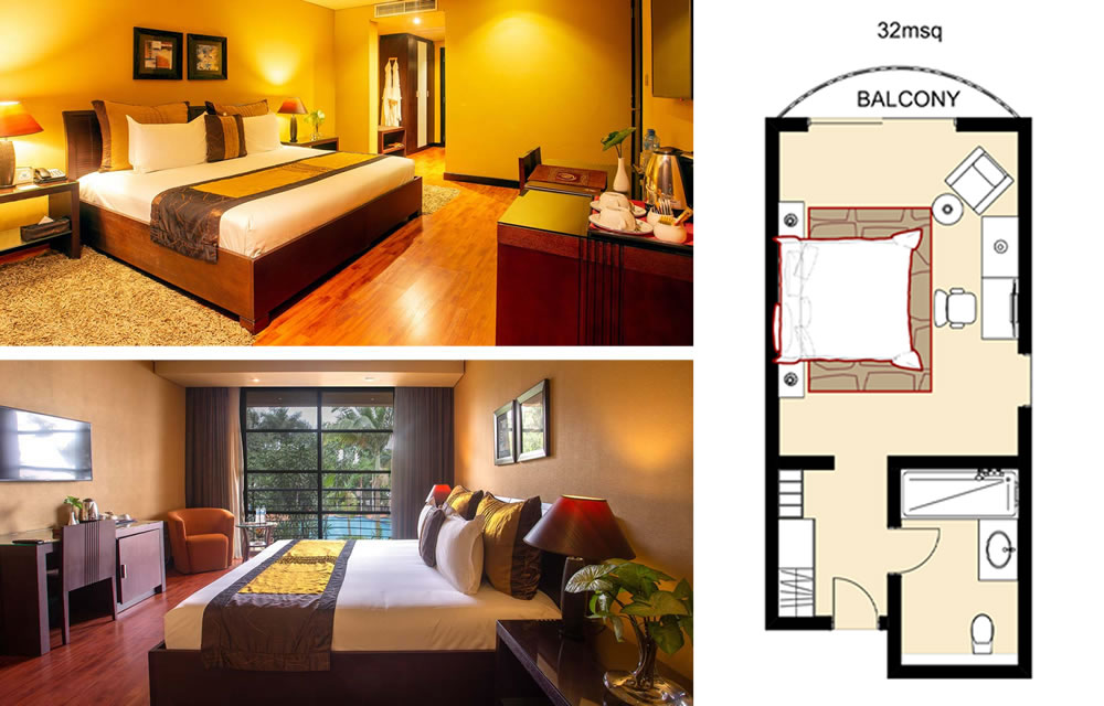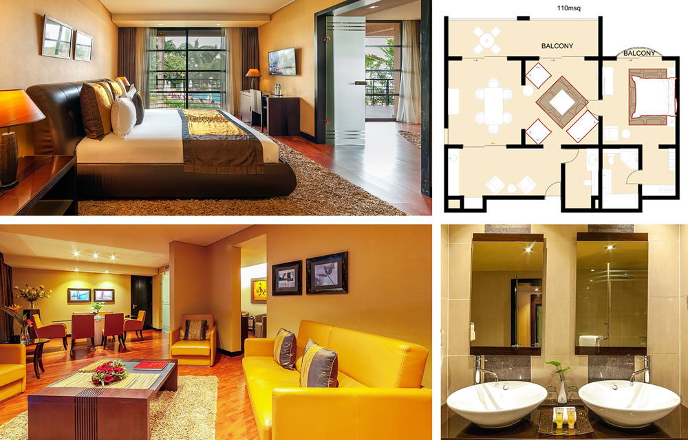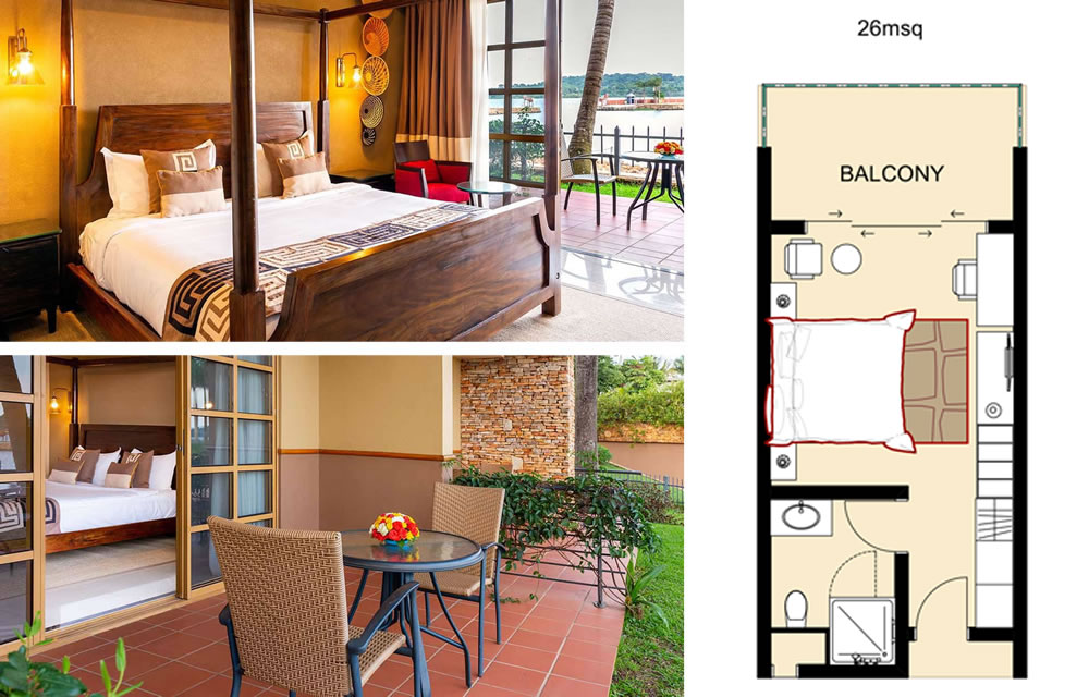 Size: 32 msq    Bedrooms: Two (on first floor) Bed Type: King    Up to 2 Guests    Bathrooms: Two     View: Gardens, Lake Victoria & Infinity Pool    Floors: Ground, First & Second    Spacious Balcony