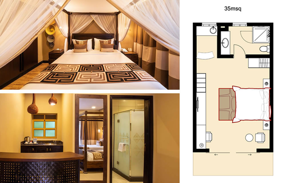 Our Superior Rooms offer the discerning visitor opulent living life style and unrivalled views of the resort and botanical gardens tastefully decorated with African art.